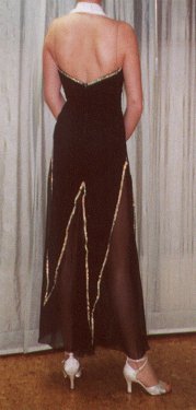 Chiffonschal angenäht. Es ist bauchfrei in Form einer Raute. Ohne Ärmel mit hautfarbenen Trägern. Rückenfrei, Kleid wird hinten mit